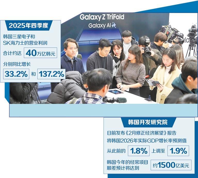 日前,韩国国策研究机构韩国开发研究院(KDI)发布《2月修正经济展望》报告,将韩国2026年的实际国内生产总值(GDP)增长率预测值从此前的1.8%上调至1.9%。有分析认为,这一调整不仅反映了半导体产业对出口的直接拉动,更预示着由技术革新驱动的产业发展正通过连锁反应,带动韩国进入出口、实际所得与消费同步改善的“三重增长”良性轨道。