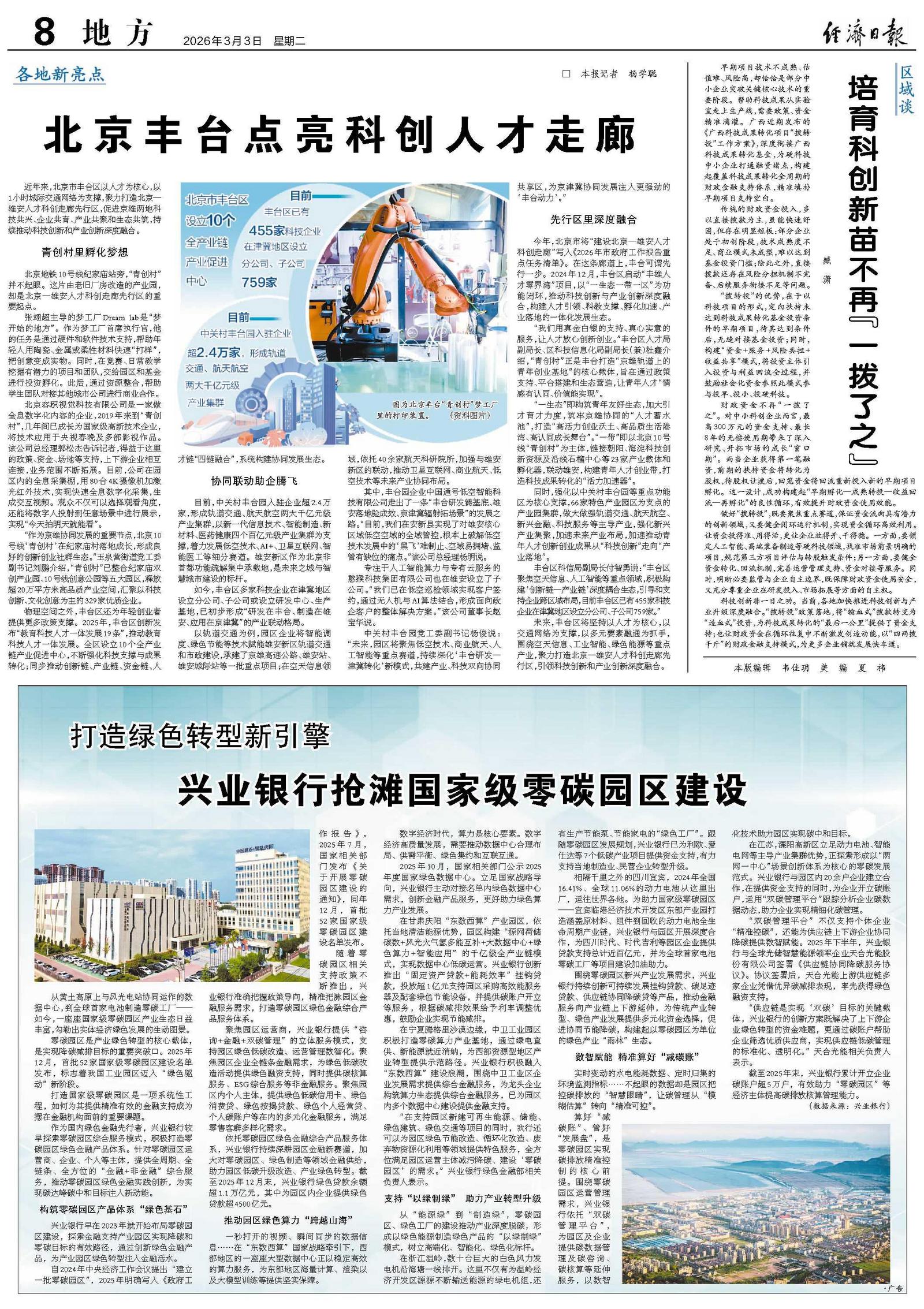今年,北京市将“建设北京—雄安人才科创走廊”写入《2026年市政府工作报告重点任务清单》。在这条廊道上,丰台可谓先行一步。2024年12月,丰台区启动“丰雄人才零界湾”项目,以“一生态一带一区”为功能闭环,推动科技创新与产业创新深度融合,构建人才引领、科教支撑、孵化加速、产业落地的一体化发展生态。