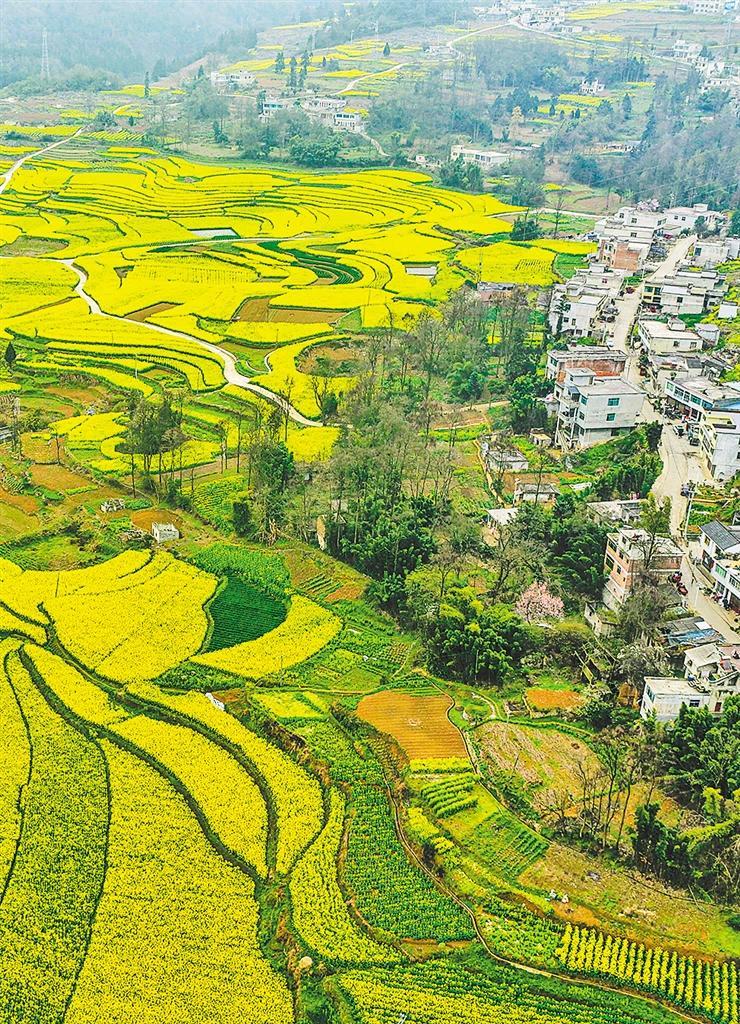 3月2日,贵州省黔西市雨朵镇梯田的油菜花陆续绽放。近年来,当地深挖传统村落历史文化,打造特色“花田经济”,助力群众增收。周训超摄(中经视觉)