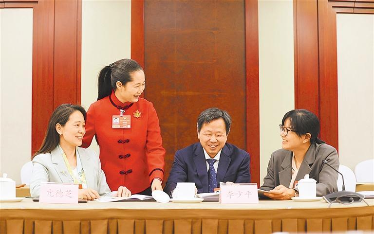 3月10日,人大湖北代表团在驻地举行小组会议。图为代表们在会后继续交流。 本报记者 高兴贵摄