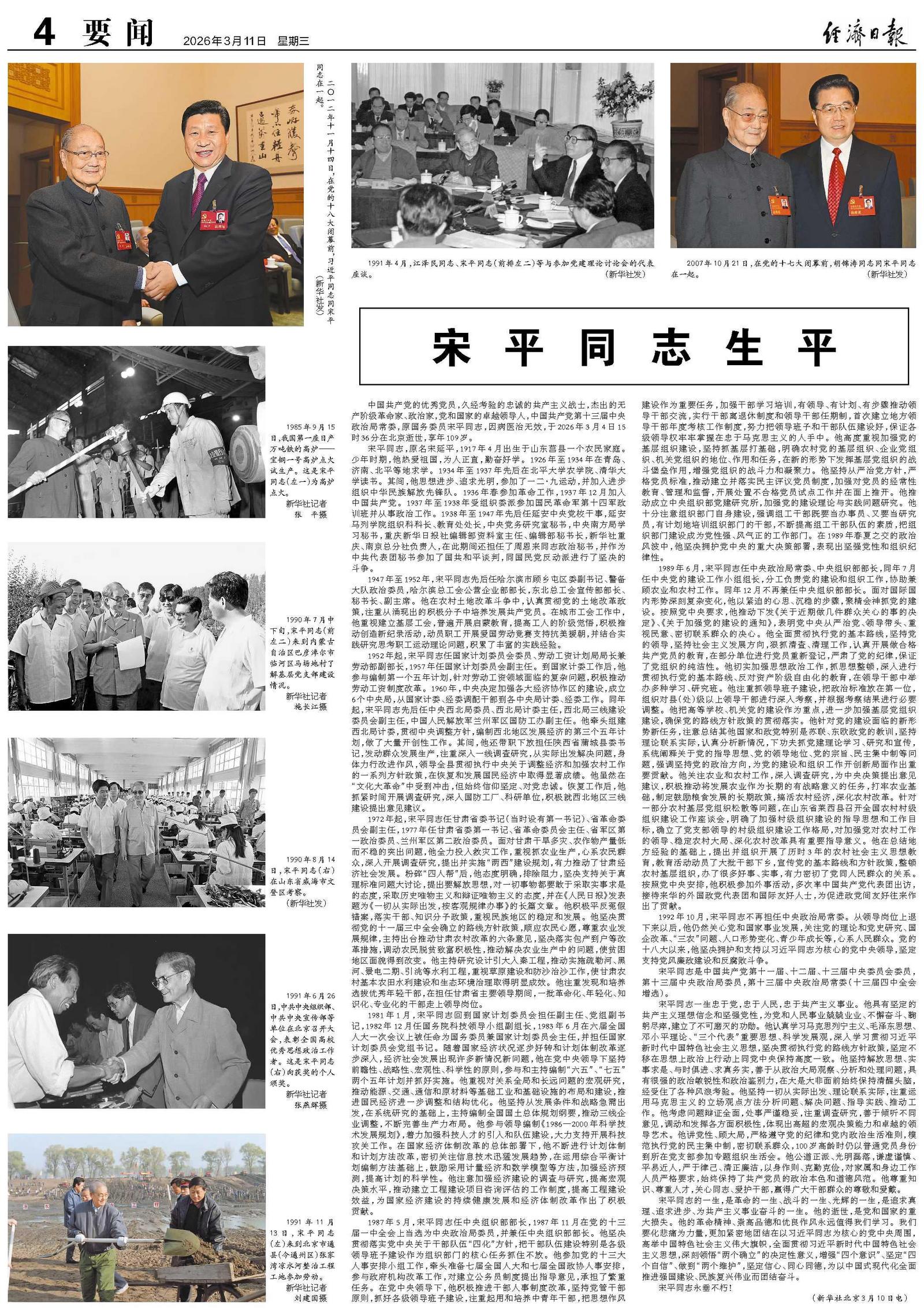 中国共产党的优秀党员,久经考验的忠诚的共产主义战士,杰出的无产阶级革命家、政治家,党和国家的卓越领导人,中国共产党第十三届中央政治局常委,原国务委员宋平同志,因病医治无效,于2026年3月4日15时36分在北京逝世,享年109岁。