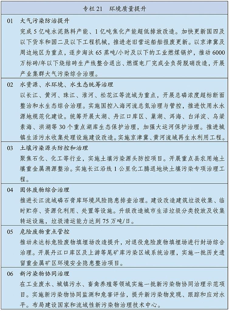持续深入推进污染防治攻坚,以更高标准改善大气、水、土壤环境质量。以京津冀及周边、长三角、汾渭平原等重点区域为主战场,强化细颗粒物(PM_2.5)控制,深入推进重点行业超低排放改造,推动挥发性有机物源头替代和全流程治理,制定下一阶段机动车排放和油品质量标准,深化大气环境绩效分级管理,氮氧化物、挥发性有机物排放量分别下降8%以上,进一步消除重污染天气。加强长江中游、成渝等区域大气污染防治。加强餐饮油烟、恶臭异味和环境噪声污染治理。统筹水资源、水环境、水生态治理,以解决全流域和跨省界突出问题为重点,加强重要江河湖库系统治理和生态保护,基本完成重点流域海域入河入海排污口排查整治,化学需氧量、总磷排放量分别下降6%,巩固城市黑臭水体治理成效、基本消除县乡黑臭水体。加强土壤污染源头防控,推进受污染耕地、建设用地安全利用。