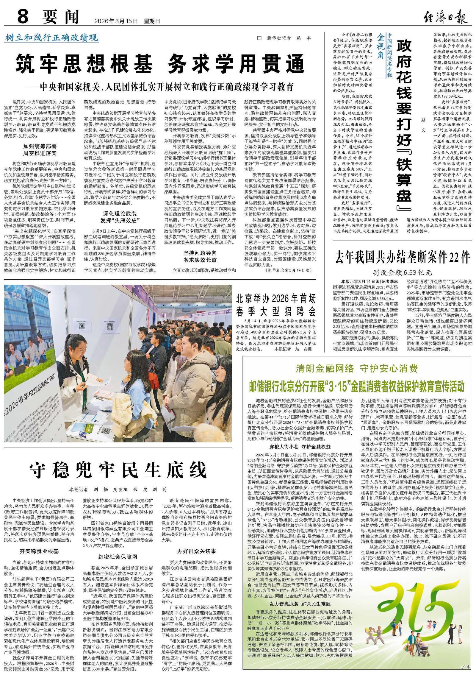 2026年3月5日至3月18日,邮储银行北京分行开展2026年“3·15”金融消费者权益保护教育宣传活动。活动以“清朗金融网络 守护安心消费”为口号,紧扣保护金融权益主旨,以正面宣传树导向,以风险提示筑防线,通过公益宣传,力争营造清朗有序的金融市场环境。一方面大力弘扬中国特色金融文化,彰显金融正能量,展现邮储银行利用数字化、科技化手段,精准满足群众多元化需求等解民忧、惠民生、暖民心的实事范例和亮点举措;另一方面针对金融网络乱象加强消保提醒提示,帮助消费者筑牢财产安全防线。