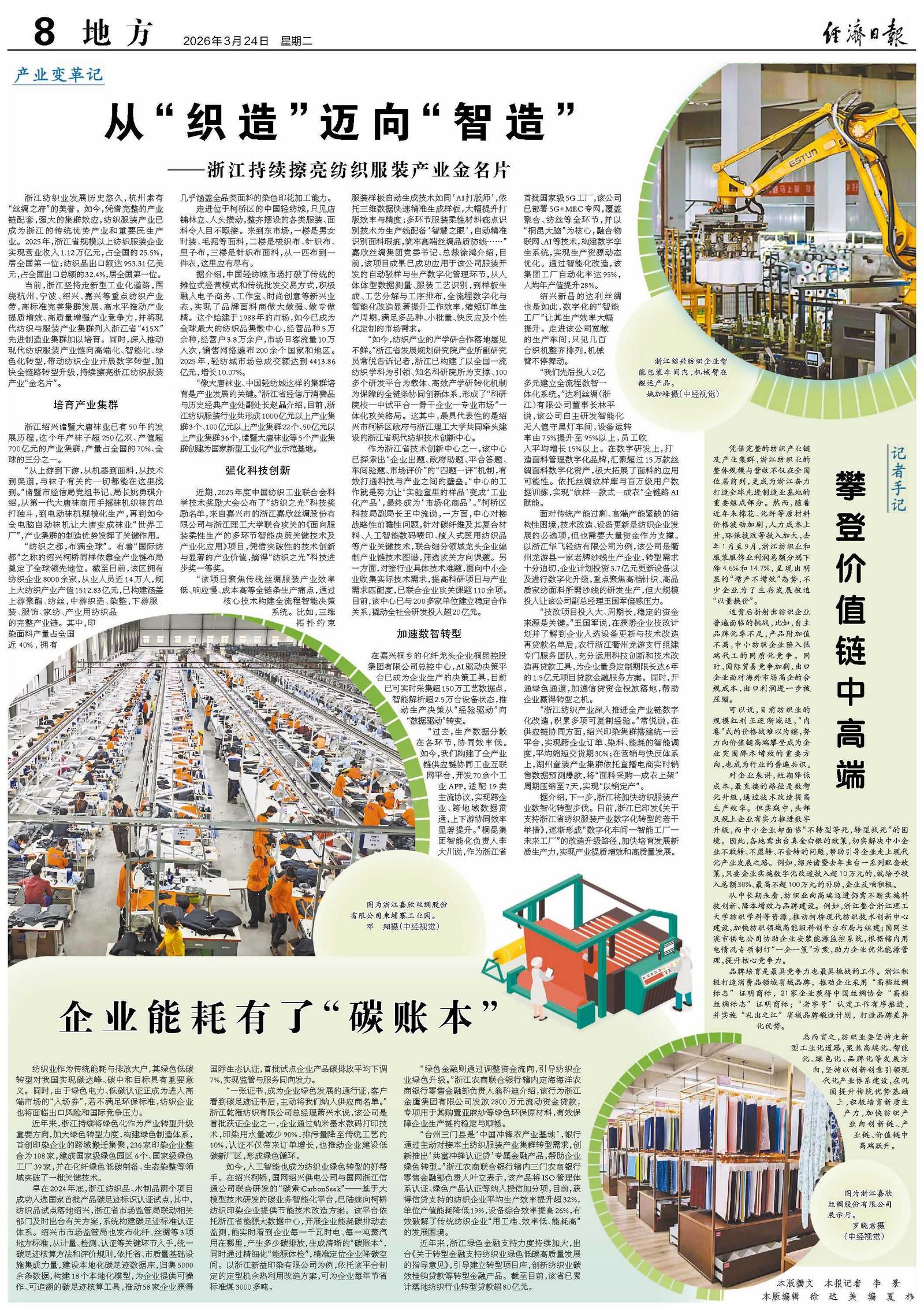 当前,浙江坚持走新型工业化道路,围绕杭州、宁波、绍兴、嘉兴等重点纺织产业带,高标准完善集群发展、高水平推动产业提质增效、高质量增强产业竞争力,并将现代纺织与服装产业集群列入浙江省“415X”先进制造业集群加以培育。同时,深入推动现代纺织服装产业链向高端化、智能化、绿色化转型,带动纺织企业开展数字转型,加快全链路转型升级,持续擦亮浙江纺织服装产业“金名片”。