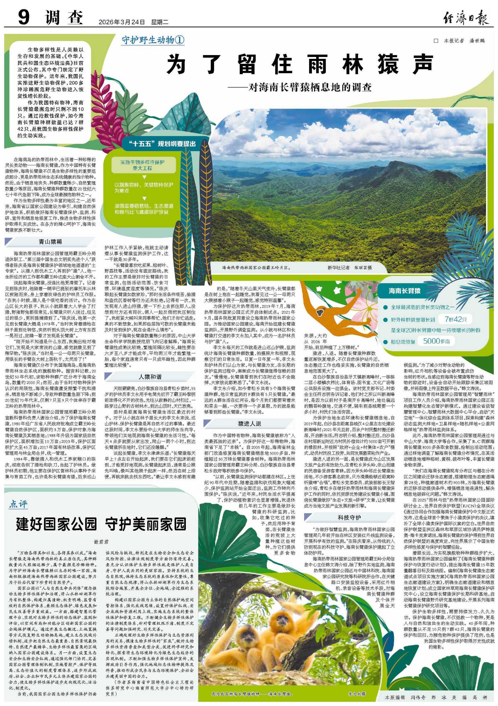 “为做好智慧监测,海南热带雨林国家公园管理局几年前开始在林区安装红外线监测设备,开展科学有效的监测。”在陈庆看来,从传统的人防到现在的科技守护,海南长臂猿保护建起了立体防护网。