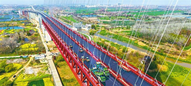 3月28日,位于安徽省马鞍山市的马鞍山长江公铁大桥主桥公路面,工人正在进行钢桥面沥青铺摊作业。目前,该大桥已完成合龙与铺轨,进入附属设施安装等收官冲刺阶段。王文生摄(中经视觉)