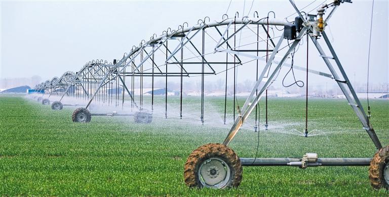 3月28日,山东省东营市广饶县李鹊镇安里村的高标准农田,桁架式喷灌机正在为小麦浇水。近段时间,当地农民抢抓农时,做好小麦春管,确保增产增收。
