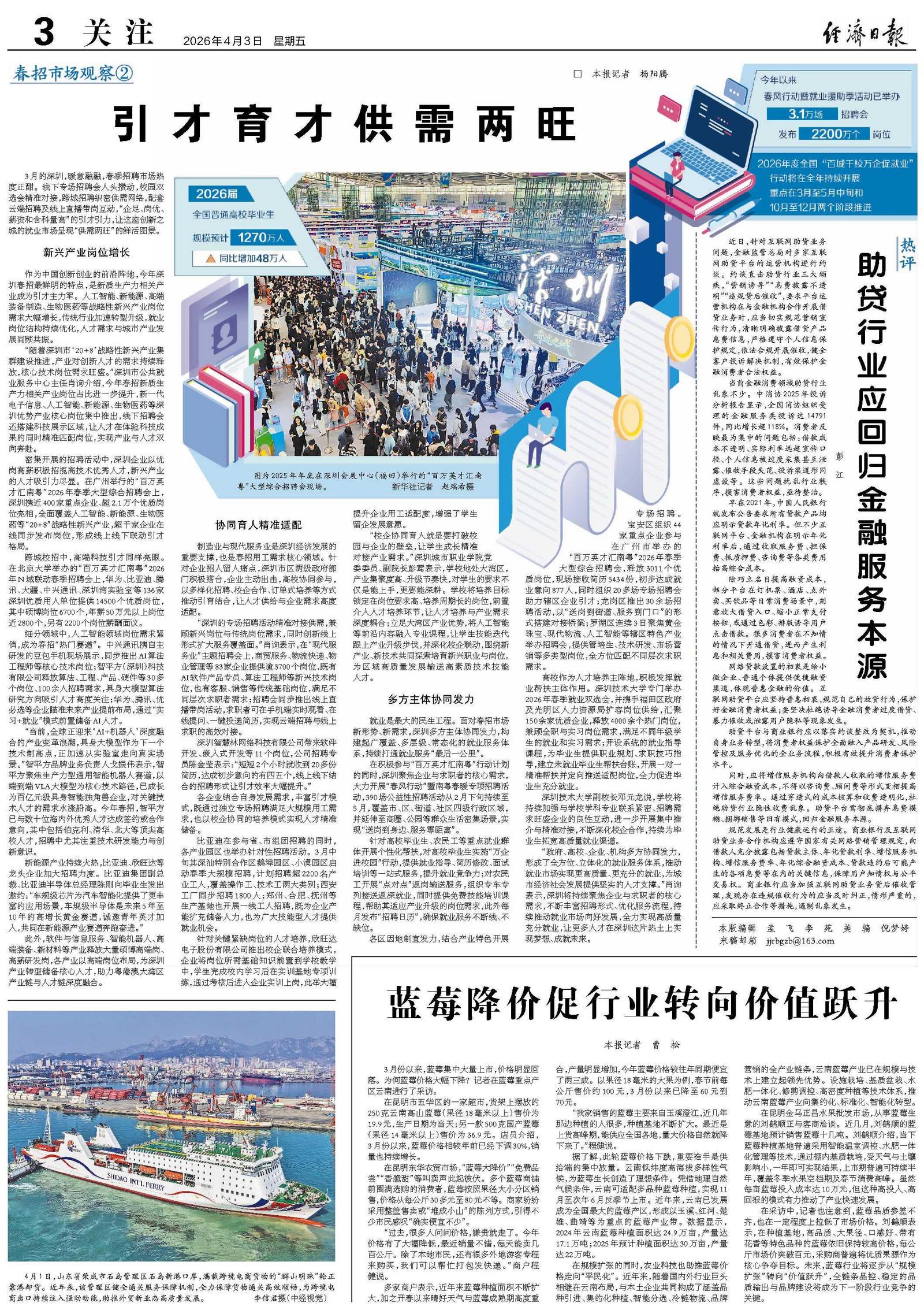 制造业与现代服务业是深圳经济发展的重要支撑,也是春招用工需求核心领域。针对企业招人留人痛点,深圳市区两级政府部门积极搭台,企业主动出击,高校协同参与,以多样化招聘、校企合作、订单式培养等方式推动引育结合,让人才供给与企业需求高度适配。