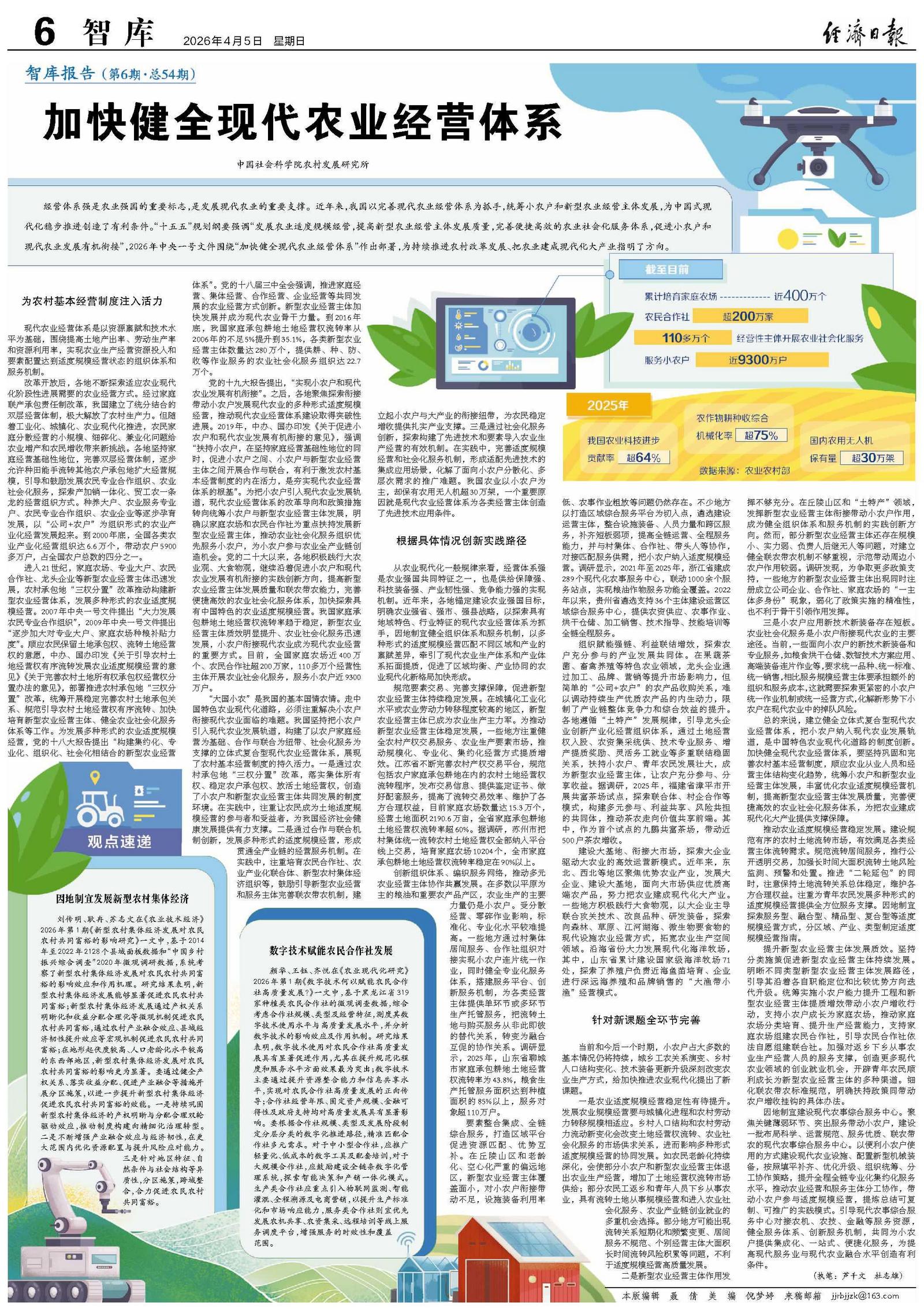 经营体系强是农业强国的重要标志,是发展现代农业的重要支撑。近年来,我国以完善现代农业经营体系为抓手,统筹小农户和新型农业经营主体发展,为中国式现代化稳步推进创造了有利条件。“十五五”规划纲要强调“发展农业适度规模经营,提高新型农业经营主体发展质量,完善便捷高效的农业社会化服务体系,促进小农户和现代农业发展有机衔接”,2026年中央一号文件围绕“加快健全现代农业经营体系”作出部署,为持续推进农村改革发展、把农业建成现代化大产业指明了方向。