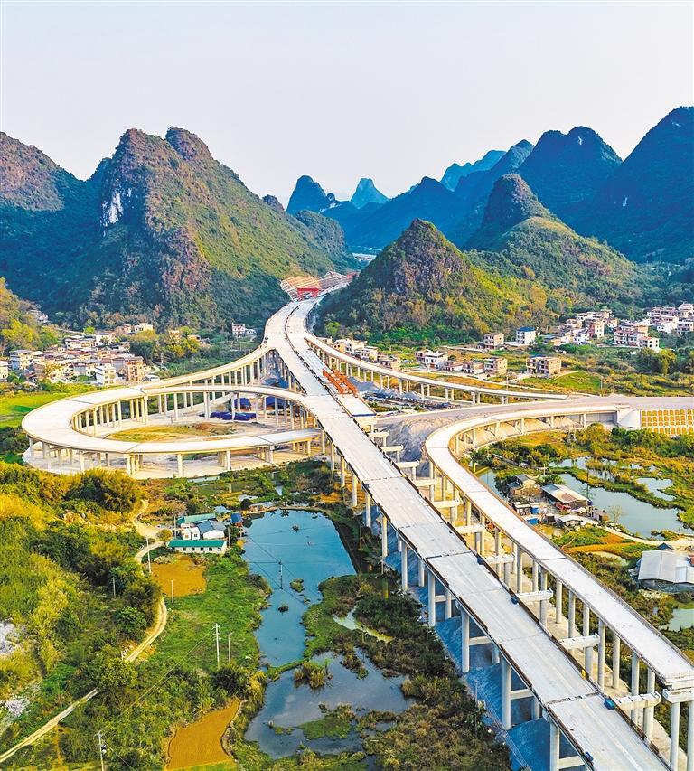 3月14日,广西桂林市阳朔县兴坪镇,建设中的桂钟高速公路兴坪互通段,高架桥与山峰相映成景。 黄胜林摄(中经视觉)
