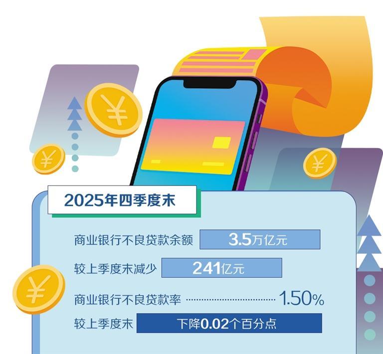 目前来看,我国银行业不良资产处置稳步有序。2025年四季度末,商业银行不良贷款余额3.5万亿元,较上季度末减少241亿元;商业银行不良贷款率1.50%,较上季度末下降0.02个百分点。