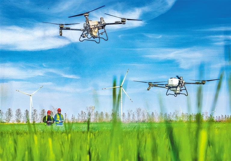 4月7日,在江苏省盐城市射阳县,江苏农垦新洋农场的农技人员操作无人机开展春季田管作业。当前,正值春季田管关键时期,该农场通过智能化作业做好田间作物管理,为夏粮丰收打好基础。张伟生摄(中经视觉)