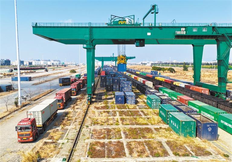 2月9日,福建省江阴港装卸繁忙。该港依托海铁联运“港站一体化”模式,直卸进港集装箱运量已突破10000箱。郑则民摄(中经视觉)