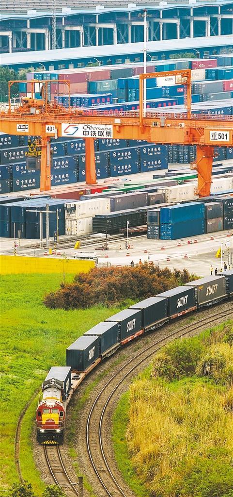 3月27日,重庆市沙坪坝区铁路团结村中心站,一列中欧班列(成渝)列车驶出站台。