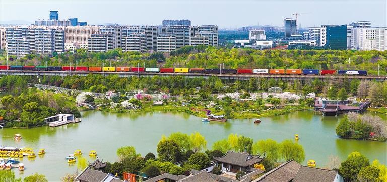4月4日,一列满载集装箱的列车途经浙江省宁波镇海植物园。宁波舟山港积极发挥海铁联运等多式联运优势,海铁联运线路超110条。