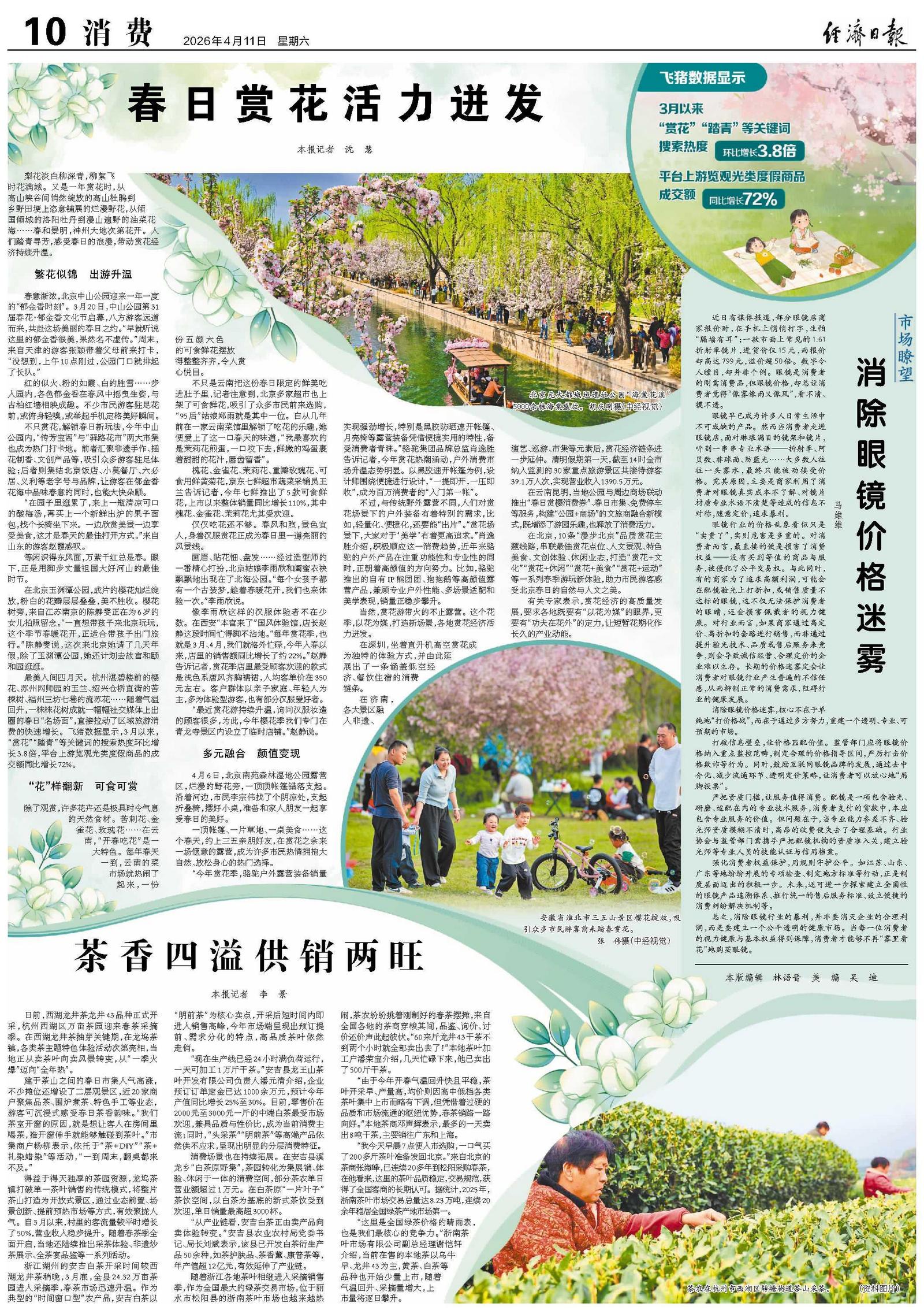 最美人间四月天。杭州湛碧楼前的樱花、苏州网师园的玉兰、绍兴仓桥直街的苦楝树、福州三坊七巷的流苏花……随着气温回升,一株株花树成就一幅幅社交媒体上出圈的春日“名场面”,直接拉动了区域旅游消费的快速增长。飞猪数据显示,3月以来,“赏花”“踏青”等关键词的搜索热度环比增长3.8倍,平台上游览观光类度假商品的成交额同比增长72%。
