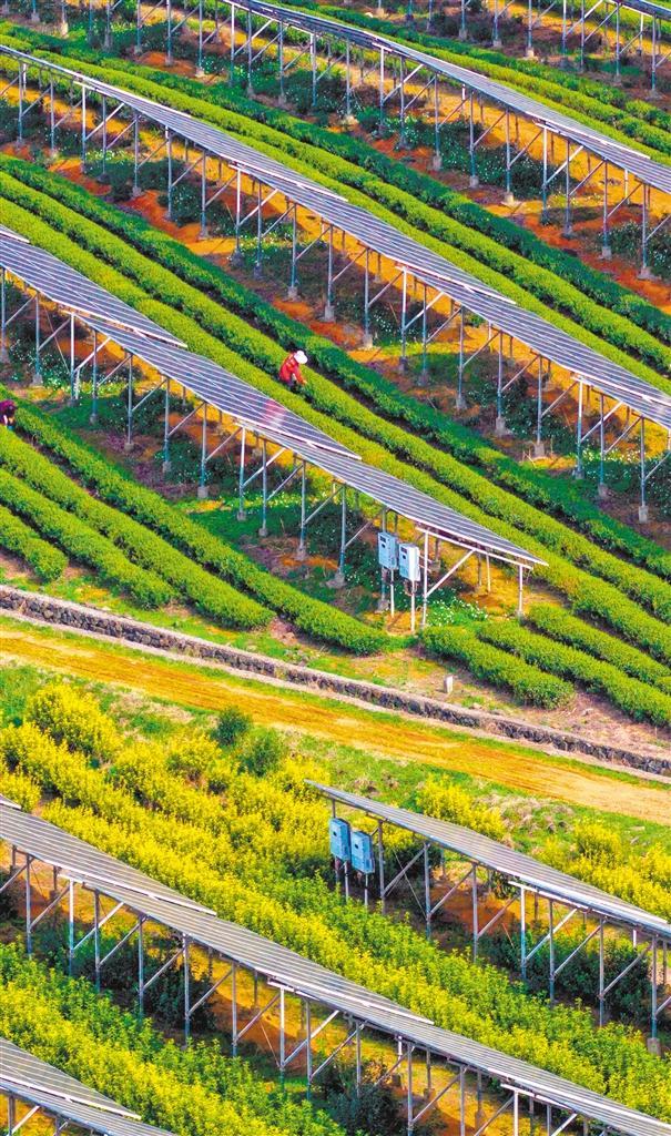 4月2日,浙江省绍兴市嵊州市三界镇懿晖光伏电站,茶农在采摘茶叶,这种“茶光互补”光伏发电模式,实现“一地两用、一地双收”。潘伟峰摄(中经视觉)