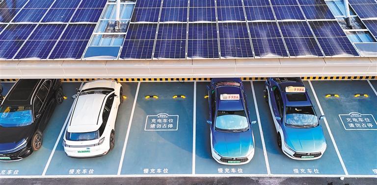 3月22日,江苏省连云港市海州区交控绿能超充站,新能源汽车在充电。目前,我国电动汽车充电基础设施(枪)总数超2100万个。