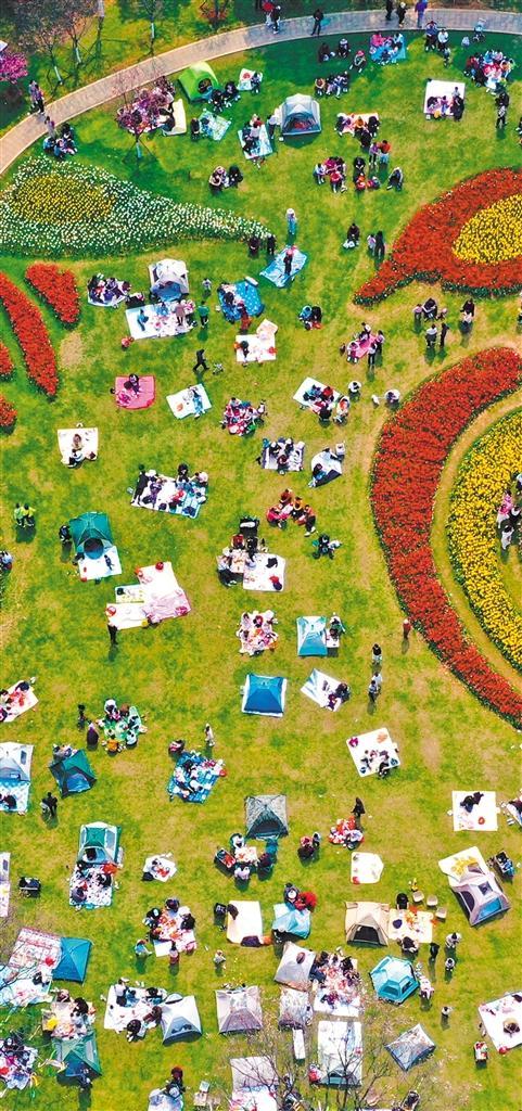 4月4日,市民在湖北省黄石市黄石奥体公园休闲露营,享受春日美好时光。周 巍摄(中经视觉)