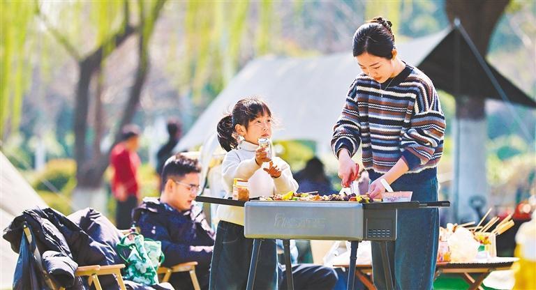 3月14日,浙江省嘉兴市南湖区一公园绿地,市民在露营烧烤。