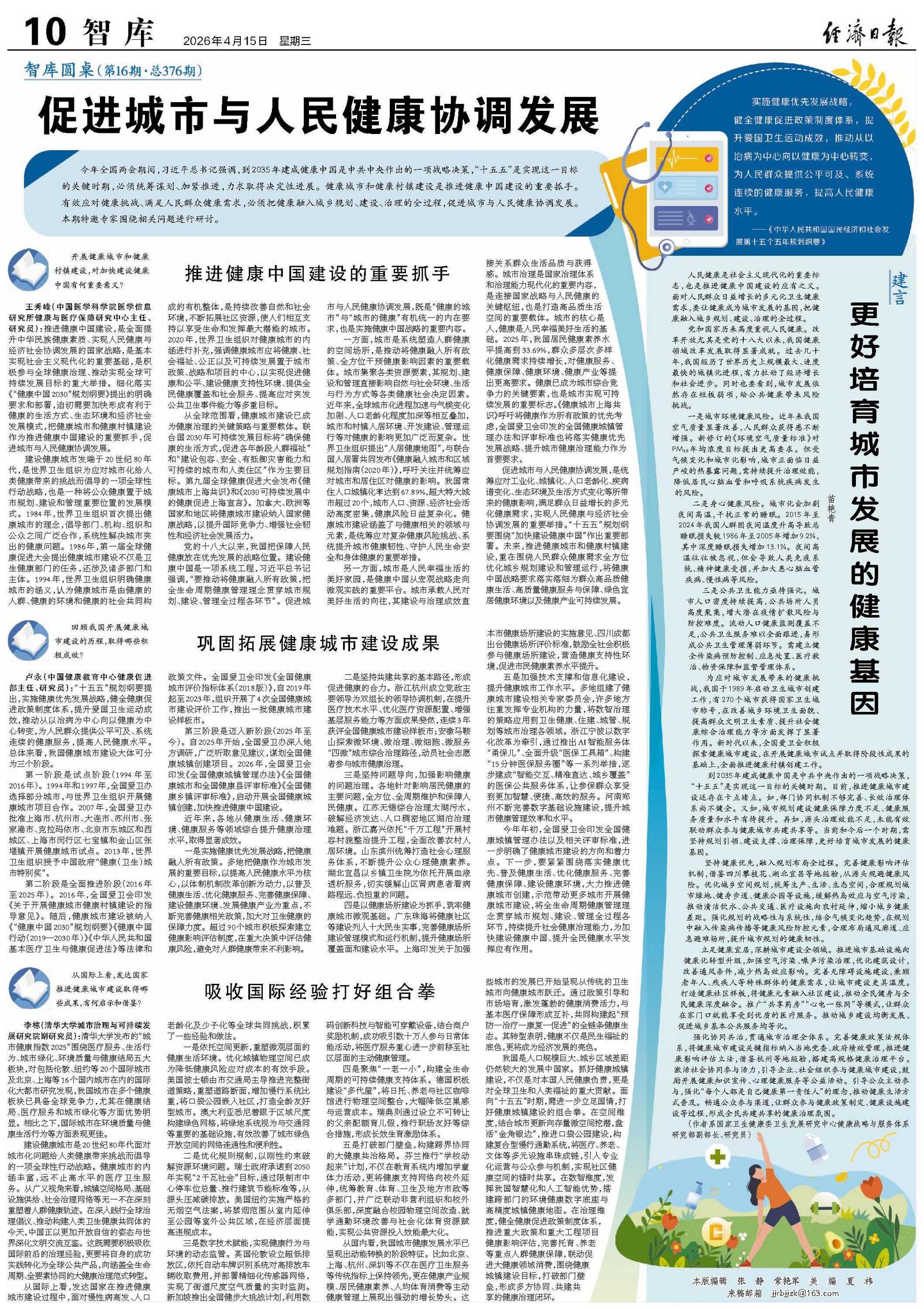 到2035年建成健康中国是中共中央作出的一项战略决策,“十五五”是实现这一目标的关键时期。目前,推进健康城市建设还存在卡点堵点。如,部门协同机制不够完善、长效治理体系尚不健全。又如,城市规划建设健康保障力度不足、健康服务质量和水平有待提升。再如,源头治理效能不足,未能有效联动群众参与健康城市共建共享等。当前和今后一个时期,需坚持规划引领、建设支撑、治理保障,更好培育城市发展的健康基因。