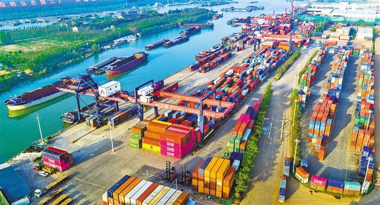 近年来,京杭大运河江苏淮安港港口货物及集装箱吞吐量持续增长,集装箱量连续17年居全省内河首位,外贸、海铁联运箱量大幅增长,“水运淮安”迈入高质量运营期。图为京杭大运河淮安港及相连的海铁联运货场春意盎然,一派繁忙景象。