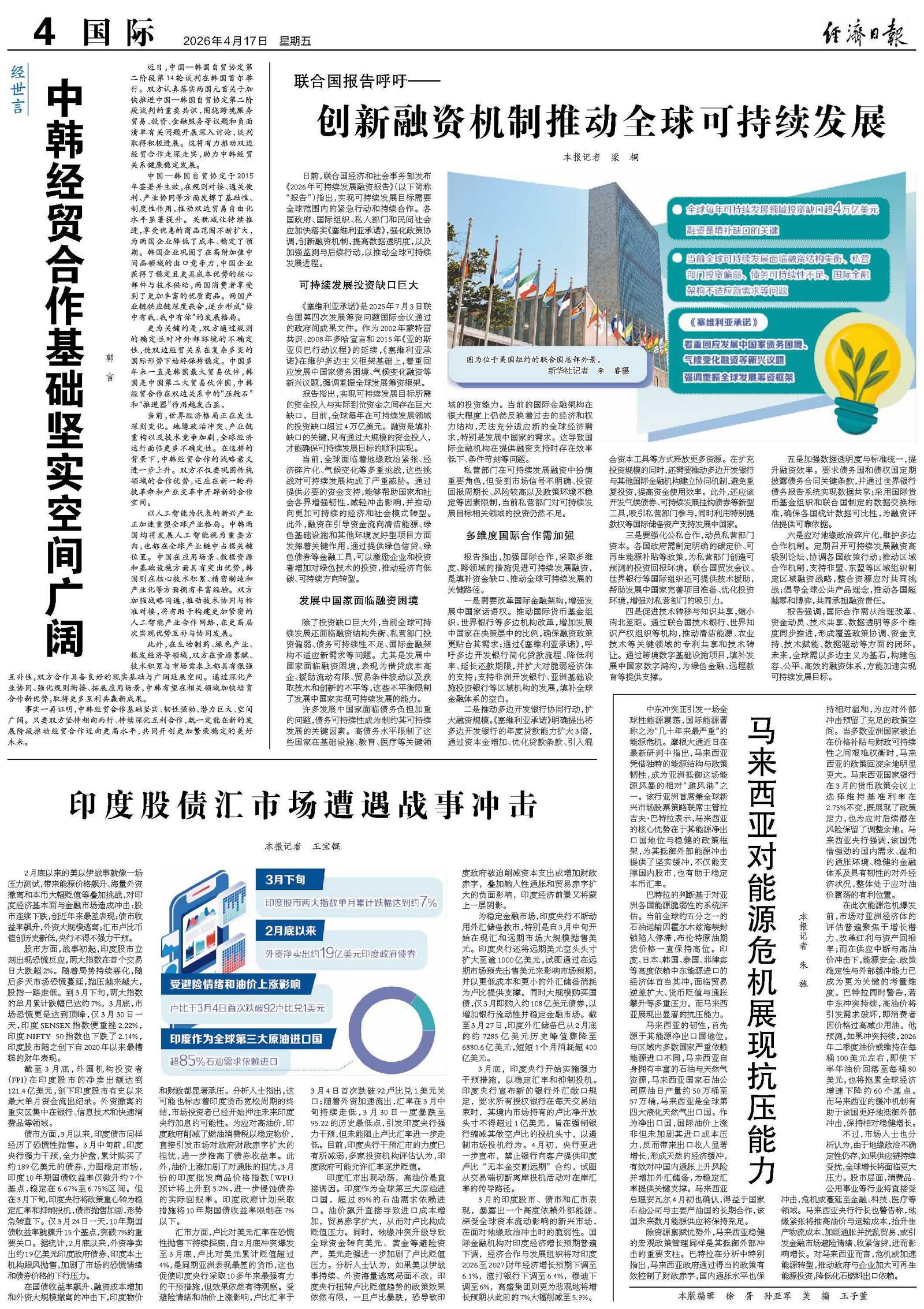 日前,联合国经济和社会事务部发布《2026年可持续发展融资报告》(以下简称“报告”)指出,实现可持续发展目标需要全球范围内的紧急行动和持续合作。各国政府、国际组织、私人部门和民间社会应加快落实《塞维利亚承诺》,强化政策协调,创新融资机制,提高数据透明度,以及加强监测与后续行动,以推动全球可持续发展进程。