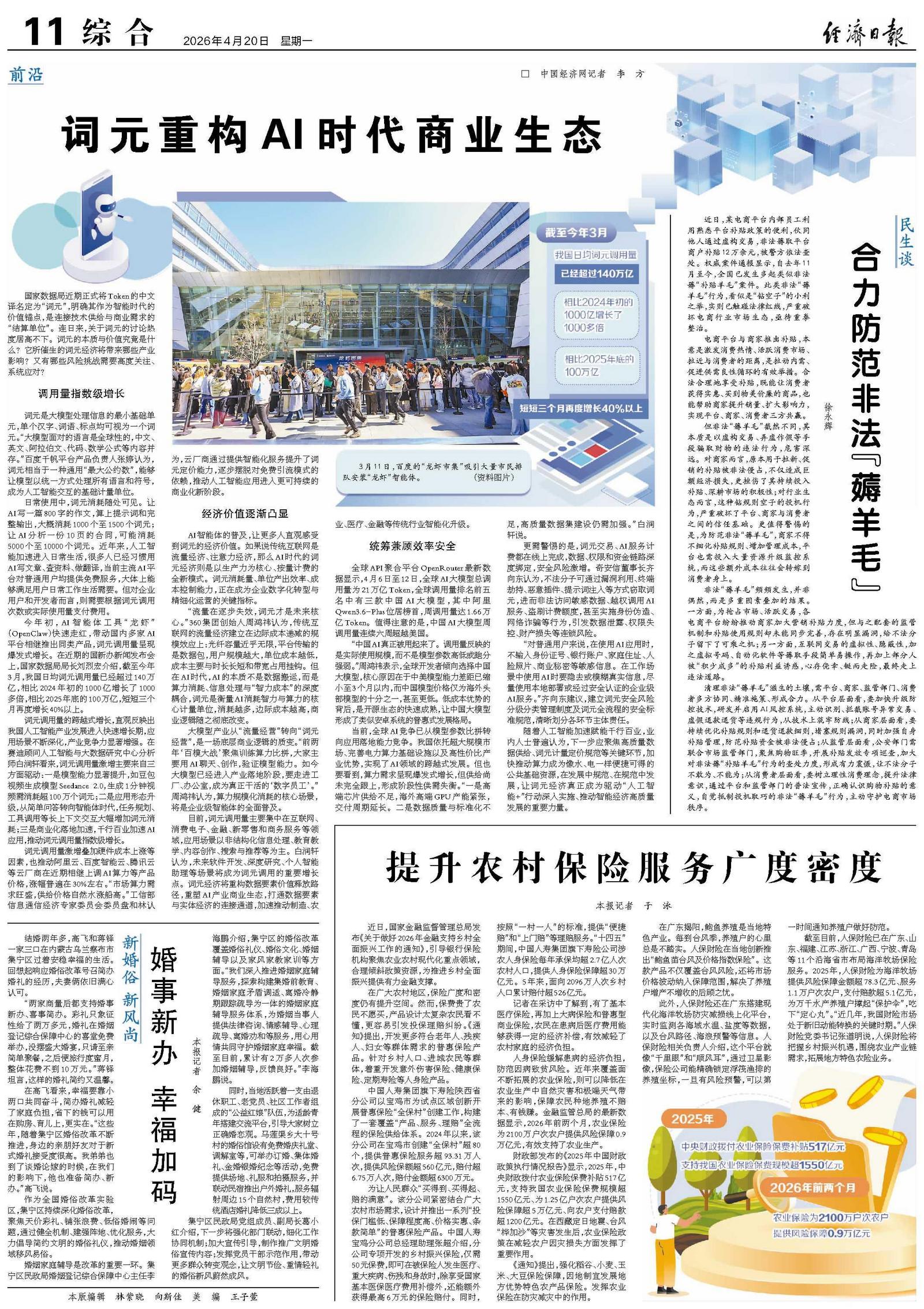 人身保险缓解患病的经济负担,防范因病致贫风险。近年来覆盖面不断拓展的农业保险,则可以降低在农业生产中自然灾害和极端天气带来的影响,保障农民种地养殖不赔本、有钱赚。金融监管总局的最新数据显示,2026年前两个月,农业保险为2100万户次农户提供风险保障0.9万亿元,有效支持了农业生产。