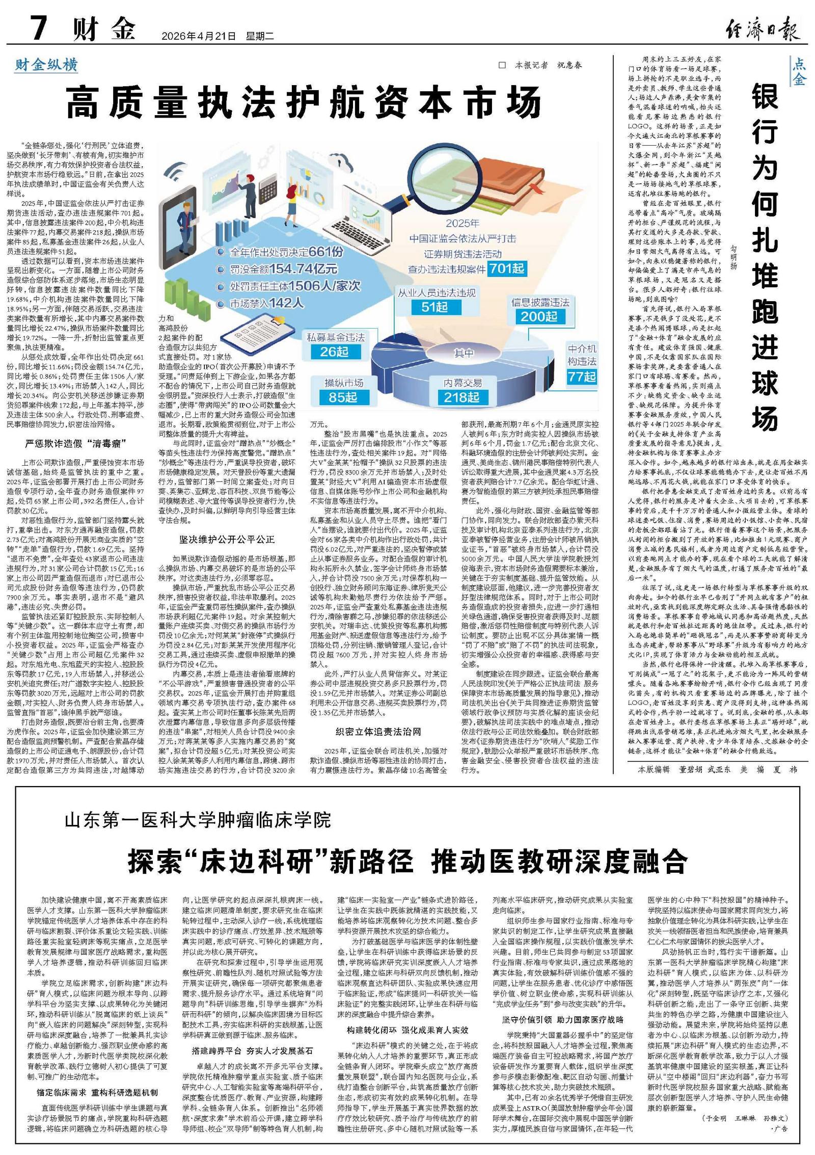 此外,强化与财政、国资、金融监管等部门协作,同向发力。联合财政部查办紫天科技及审计机构北京亚泰系列违法行为,北京亚泰被暂停经营业务,注册会计师被吊销执业证书,“首恶”被终身市场禁入,合计罚没5000余万元。中国人民大学法学院教授刘俊海表示,资本市场财务造假需要标本兼治,关键在于夯实制度基础、提升监管效能。从制度建设层面,他建议,进一步完善投资者友好型法律规范体系。同时,对于上市公司财务造假造成的投资者损失,应进一步打通相关绿色通道,确保受害投资者获得及时、足额赔偿,激活惩罚性赔偿制度与特别代表人诉讼制度。要防止出现不区分具体案情一概“罚了不赔”或“赔了不罚”的执法司法现象,切实增强公众投资者的幸福感、获得感与安全感。