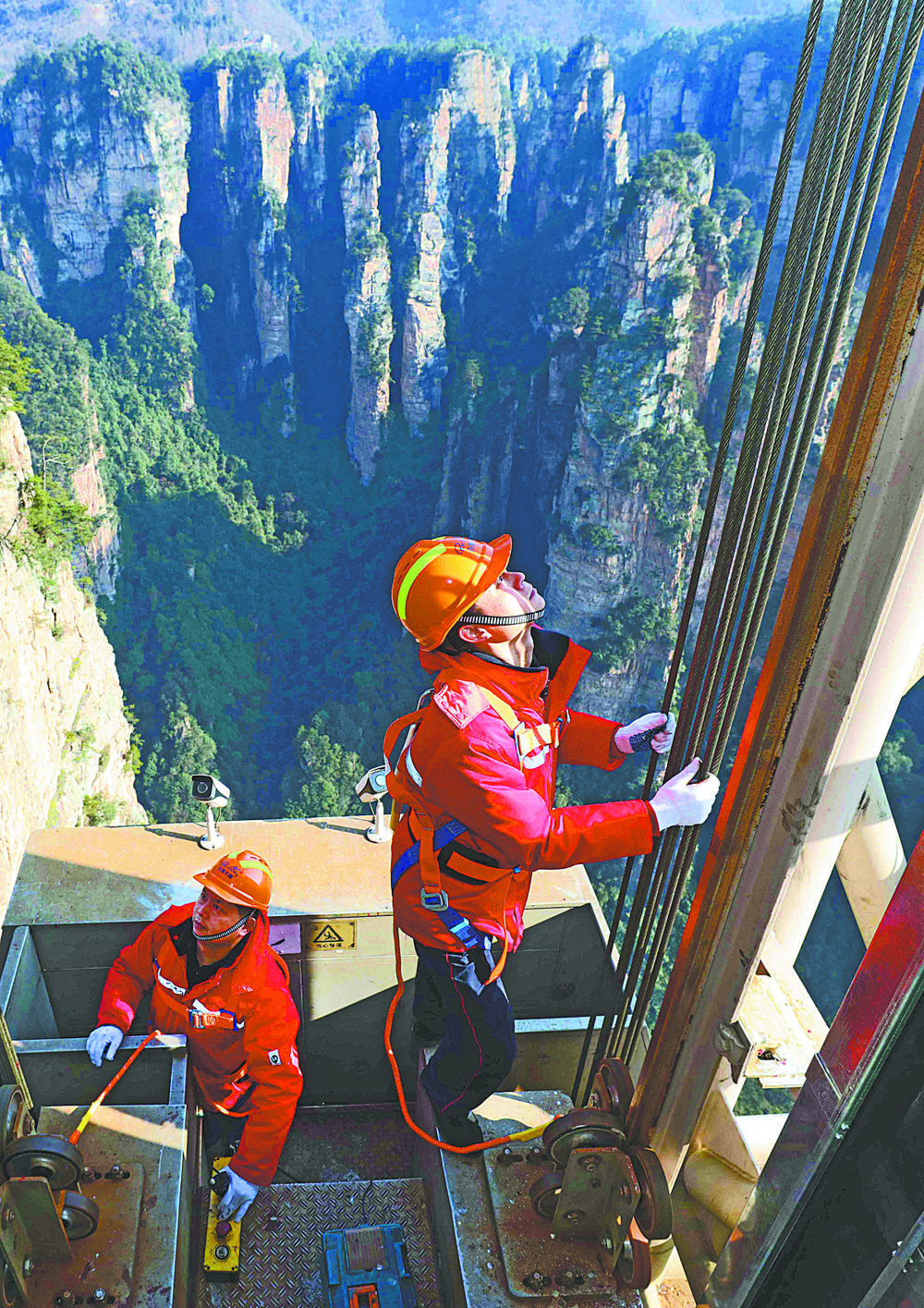 1月1日,湖南省张家界市武陵源景区,工作人员在悬崖钢井架上检查百龙天梯运行情况,确保设备正常运转。 吴勇兵摄(中经视觉)