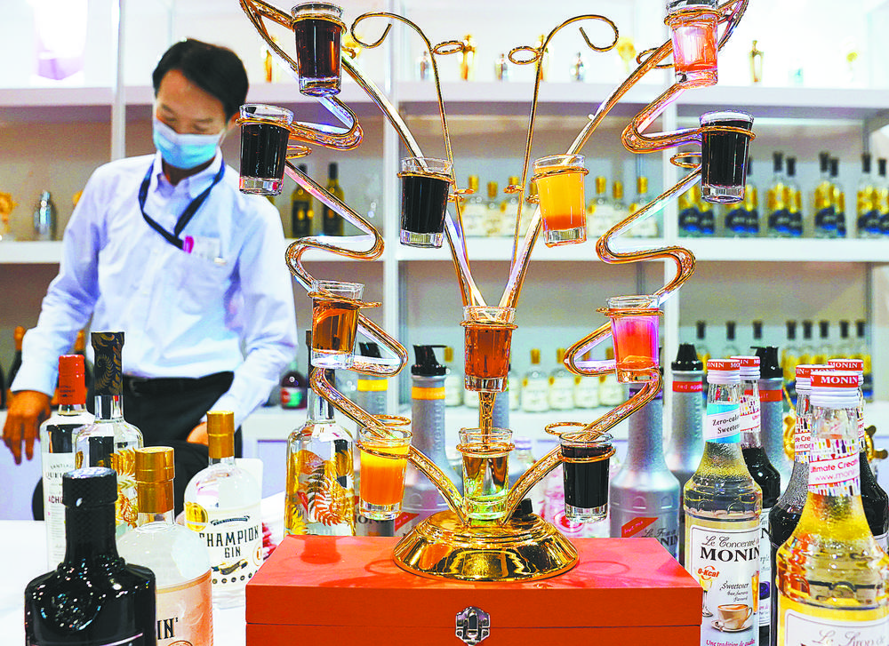 近日,“香港餐饮展暨亚洲高端食品展”在香港会议展览中心举行,约200家企业参展。图为展览现场的饮品展台。