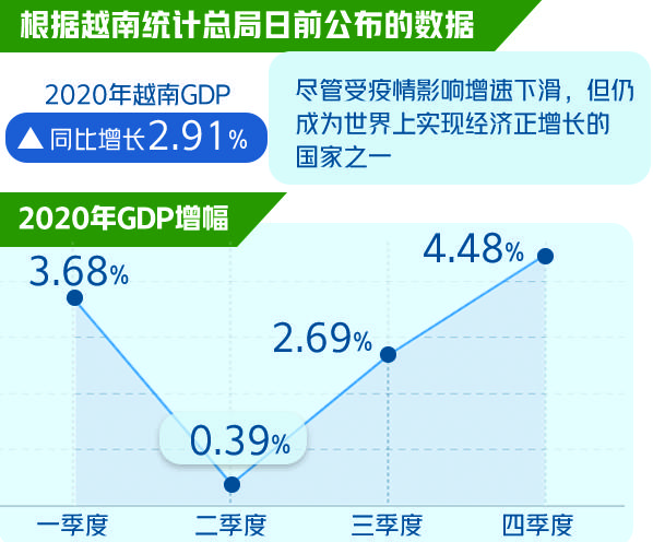 本报河内讯(记者赵青)越南统计总局日前公布的数据显示,2020年越南GDP同比增长2.91%,尽管受新冠肺炎疫情影响,较2019年7.02%的增速有所下滑,但仍实现了经济正增长。