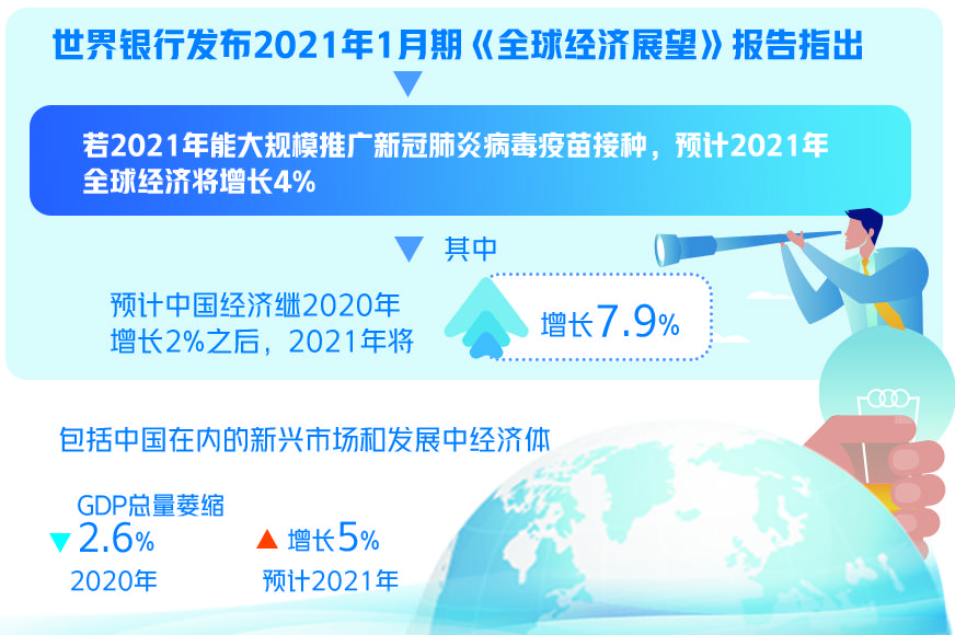 本报讯(记者高伟东)美国当地时间1月5日,世界银行发布2021年1月期《全球经济展望》报告指出,若2021年能大规模推广新冠肺炎病毒疫苗接种,预计2021年全球经济将增长4%。其中,预计中国经济继2020年增长2%之后,2021年将增长7.9%。