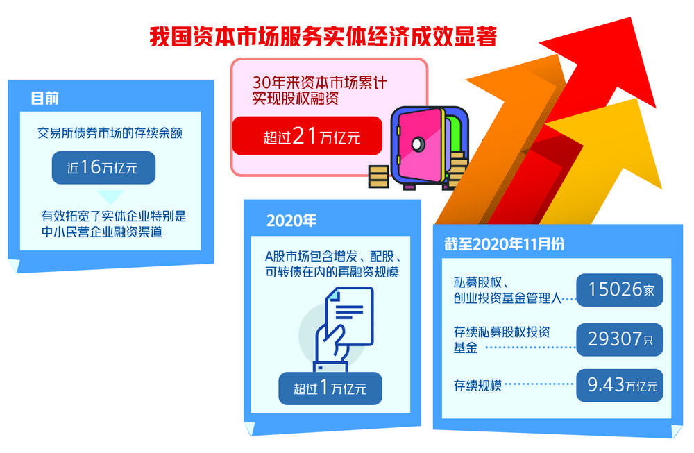 我国资本市场服务实体经济成效显著。2020年底,易会满曾表示,30年来,资本市场累计实现股权融资超过21万亿元。科创板开板以来,IPO融资金额已占同期A股的近一半,资本市场促进科技、资本和产业高水平循环的枢纽作用持续增强。目前,交易所债券市场的存续余额近16万亿元,有效拓宽了实体企业特别是中小民营企业融资渠道。
