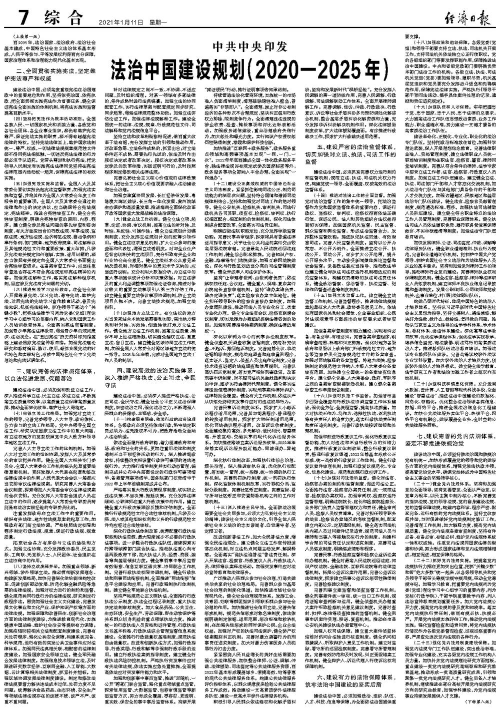 新华社北京1月10日电 近日,中共中央印发了《法治中国建设规划(2020-2025年)》,并发出通知,要求各地区各部门结合实际认真贯彻落实。