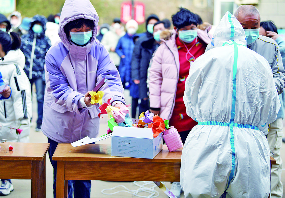 在石家庄市长安区广安街道名门华都社区,医护人员两人一组,一人负责扫描证件、另一人则熟练地进行咽拭子采样,整个过程仅需几十秒。在现场,医护人员还收到不少小朋友送上的手工折花祝福。