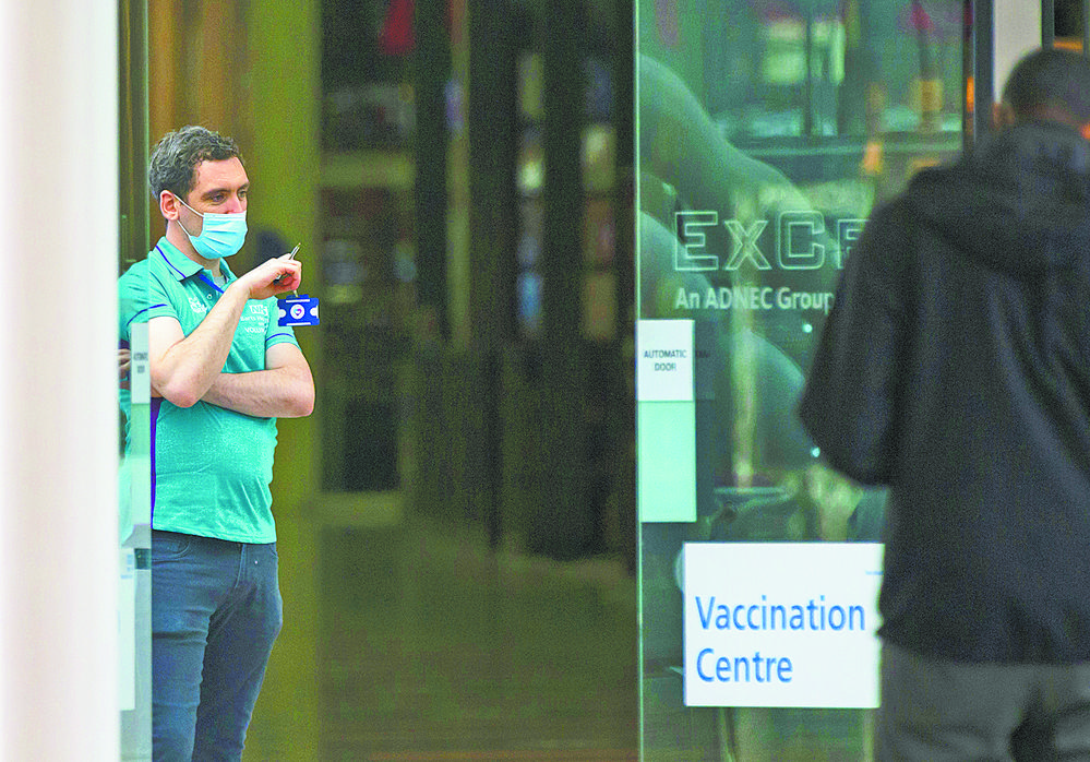 1月12日,一名工作人员站在位于英国伦敦ExCel会展中心的疫苗接种中心内。英国政府11日发布了完整的新冠疫苗接种计划。