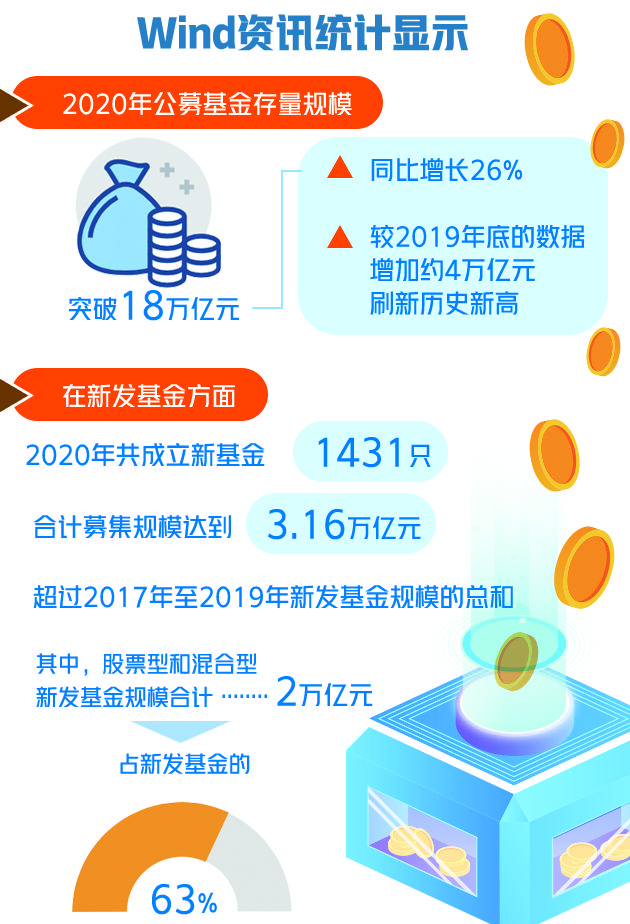 Wind资讯统计显示,2020年公募基金存量规模突破18万亿元,同比增长26%,较2019年底的数据增加约4万亿元,刷新历史新高。在新发基金方面,2020年共成立新基金1431只,合计募集规模达到3.16万亿元,超过2017年至2019年新发基金规模的总和。其中,股票型和混合型新发基金规模合计2万亿元,占新发基金的63%。