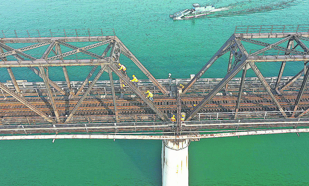 柳州工务段柳州路桥检查工区工人检修柳江铁桥钢梁顶部(1月14日摄)。连日来,中国铁路南宁局集团有限公司柳州工务段的守桥工人对柳江铁桥实施“微创修复手术”,提升铁桥线路质量,夯实安全基础。新华社记者 张爱林摄