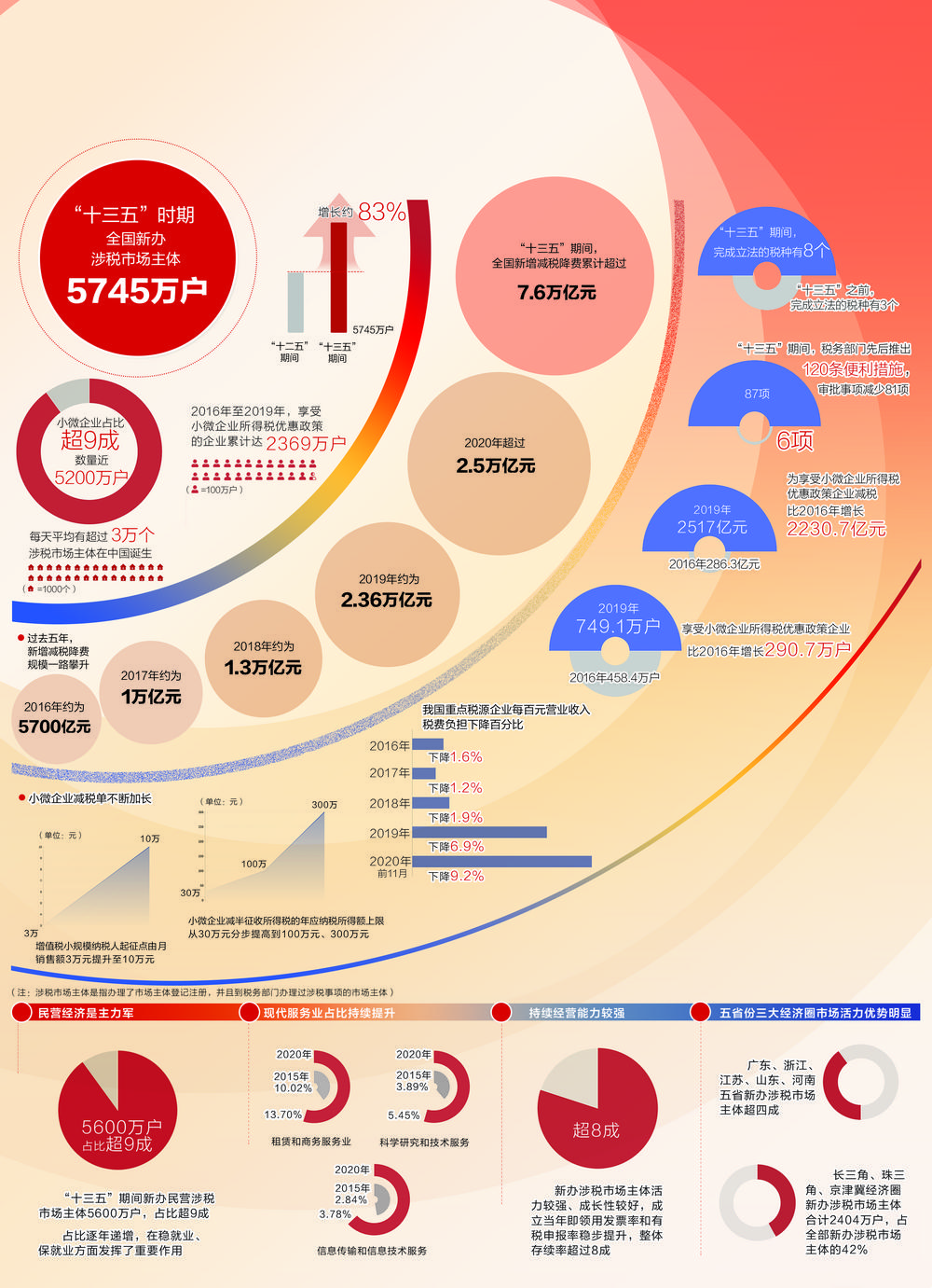 “十三五”期间,全国新办涉税市场主体共5745万户,年均超千万户,较“十二五”时期增长83%。其中,新办民营涉税市场主体5600万户,民营经济在稳就业方面发挥了重要作用。更喜人的是,新办涉税市场主体中,现代服务业的占比不断提高,充分体现了我国服务业转型取得明显成效,经济结构得到持续优化,新经济新动能正在茁壮成长。