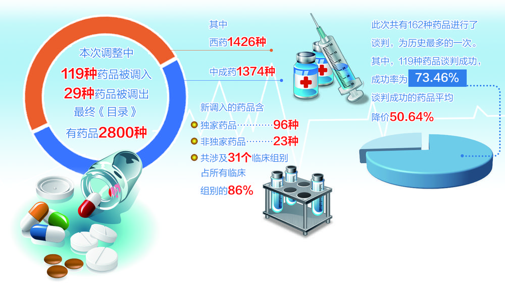 此次国家医保目录调整力度空前,且首次尝试对目录内药品进行降价谈判。共有162种药品进行了谈判,为历史最多的一次。新调入的药品含独家药品96种,非独家药品23种,共涉及31个临床组别,占所有临床组别的86%。专家表示,新入围药品在降价幅度和临床效果上实现了“较高性价比”。