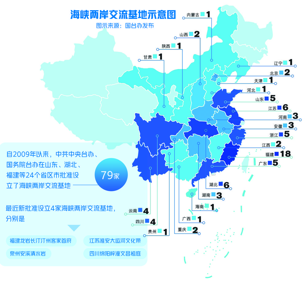 据介绍,最近新批准设立4家海峡两岸交流基地,分别是福建龙岩长汀汀州客家首府、泉州安溪清水岩,江苏淮安大运河文化带和四川绵阳梓潼文昌祖庭。自2009年以来,中共中央台办、国务院台办在山东、湖北、福建等24个省区市批准设立了79家海峡两岸交流基地。