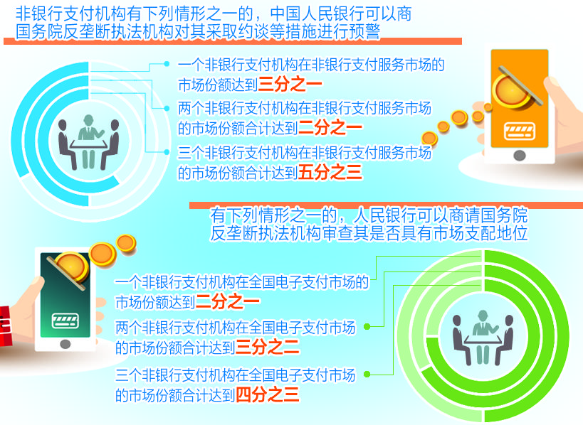 《条例》第五十五条明确,非银行支付机构有下列情形之一的,中国人民银行可以商国务院反垄断执法机构对其采取约谈等措施进行预警:一个非银行支付机构在非银行支付服务市场的市场份额达到三分之一;两个非银行支付机构在非银行支付服务市场的市场份额合计达到二分之一;三个非银行支付机构在非银行支付服务市场的市场份额合计达到五分之三。