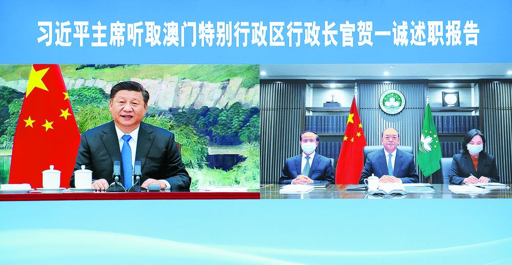 习近平说,因为疫情防控需要,这次采取视频方式听取你对2020年工作的述职报告。2020年是你和新一届特别行政区政府的开局之年。面对突如其来的新冠肺炎疫情,你们快速反应、措施有力,在较短时间内控制住了疫情,迄今已连续超过300天没有本地新增确诊病例,赢得了澳门市民和各有关方面高度赞誉。在防控疫情的同时,你们采取有力措施恢复经济、纾解民困,取得了积极成效,促进了澳门社会和谐。对你和特别行政区政府的工作,中央是充分肯定的。