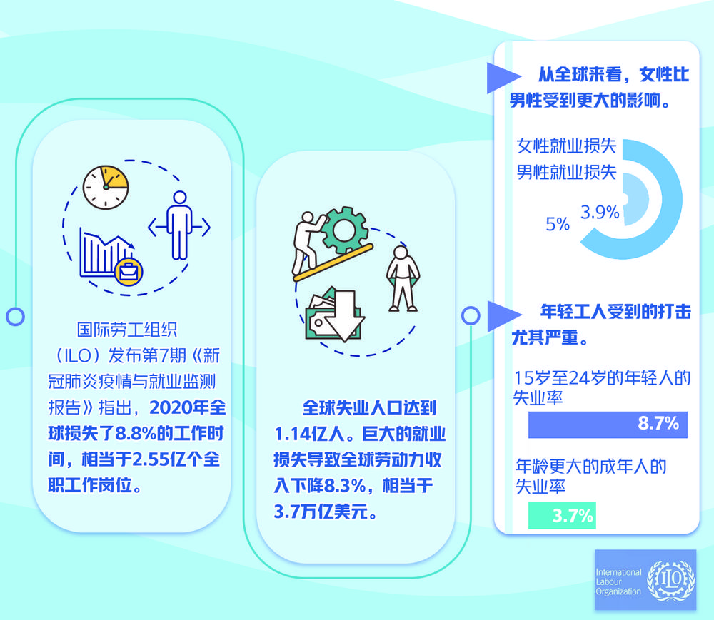 本报日内瓦讯(记者杨海泉)国际劳工组织(ILO)发布的第7期《新冠肺炎疫情与就业监测报告》指出,疫情对全球劳动力市场,特别是工作时间和收入造成巨大损害,预计2021年全球经济复苏缓慢、不均衡且存在不确定性,全球劳动力市场亟需得到以人为本的复苏政策的支持。