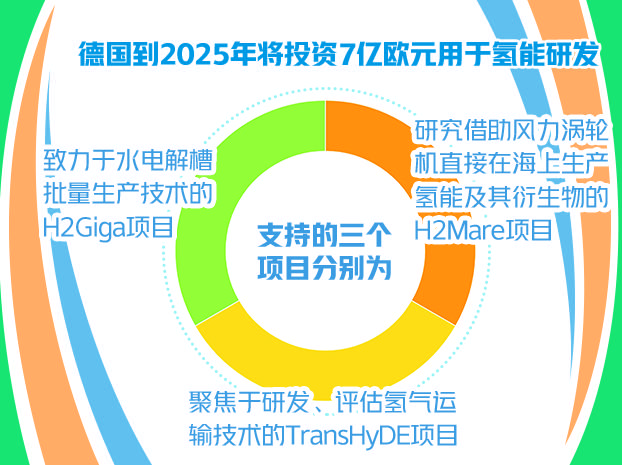 到2025年,德国将从联邦政府的“未来计划预算”中为氢能源引领项目提供7亿欧元。这是近年来联邦研发部最大的投资之一。德国政府支持的三个项目分别为:致力于水电解槽批量生产技术的H2Giga项目,研究借助风力涡轮机直接在海上生产氢能及其衍生物的H2Mare项目以及聚焦于研发、评估氢气运输技术的TransHyDE项目。