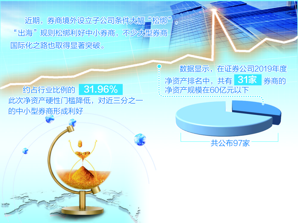 记者查阅发现,中国证券业协会2020年7月10日公布的《2019年证券公司经营业绩排名情况》数据显示,在证券公司2019年度净资产排名中,共有31家券商的净资产规模在60亿元以下,约占行业比例的31.96%(共公布97家)。也就是说,此次净资产硬性门槛降低,对近三分之一的中小型券商形成利好。