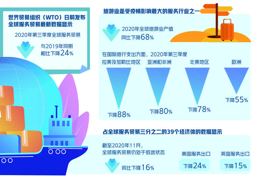 占全球服务贸易三分之二的39个经济体的数据显示,截至2020年11月,全球服务贸易仍处于低迷状态,同比下降16%,仅比10月18%的同比降幅略有改善。美国服务出口下降24%,英国下降15%,许多欧洲国家下降20%以上。