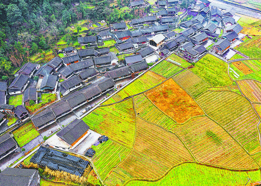 1月31日,湖南省湘西土家族苗族自治州保靖县吕洞山镇夯沙村,依山而建的苗寨与阡陌纵横的农田相映成趣,犹如一幅美丽的乡村田园画卷。张术杰摄(中经视觉)