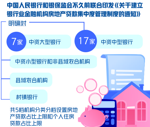 中国人民银行和银保监会不久前联合印发《关于建立银行业金融机构房地产贷款集中度管理制度的通知》,明确对7家中资大型银行、17家中资中型银行、中资小型银行和非县域农合机构、县域农合机构、村镇银行,共5档机构分类分档设置房地产贷款占比上限和个人住房贷款占比上限。其中,中资大型银行的房地产贷款占比上限被设定为40%,个人住房贷款占比上限为32.5%。其余机构的相关贷款占比则依档次不同依次减少。